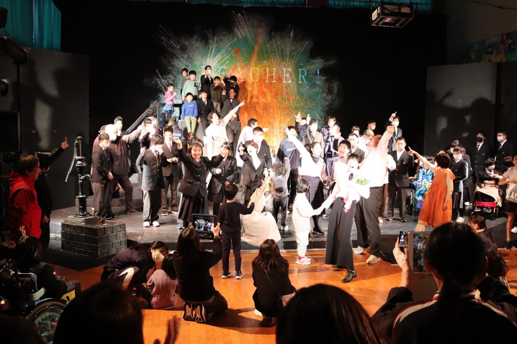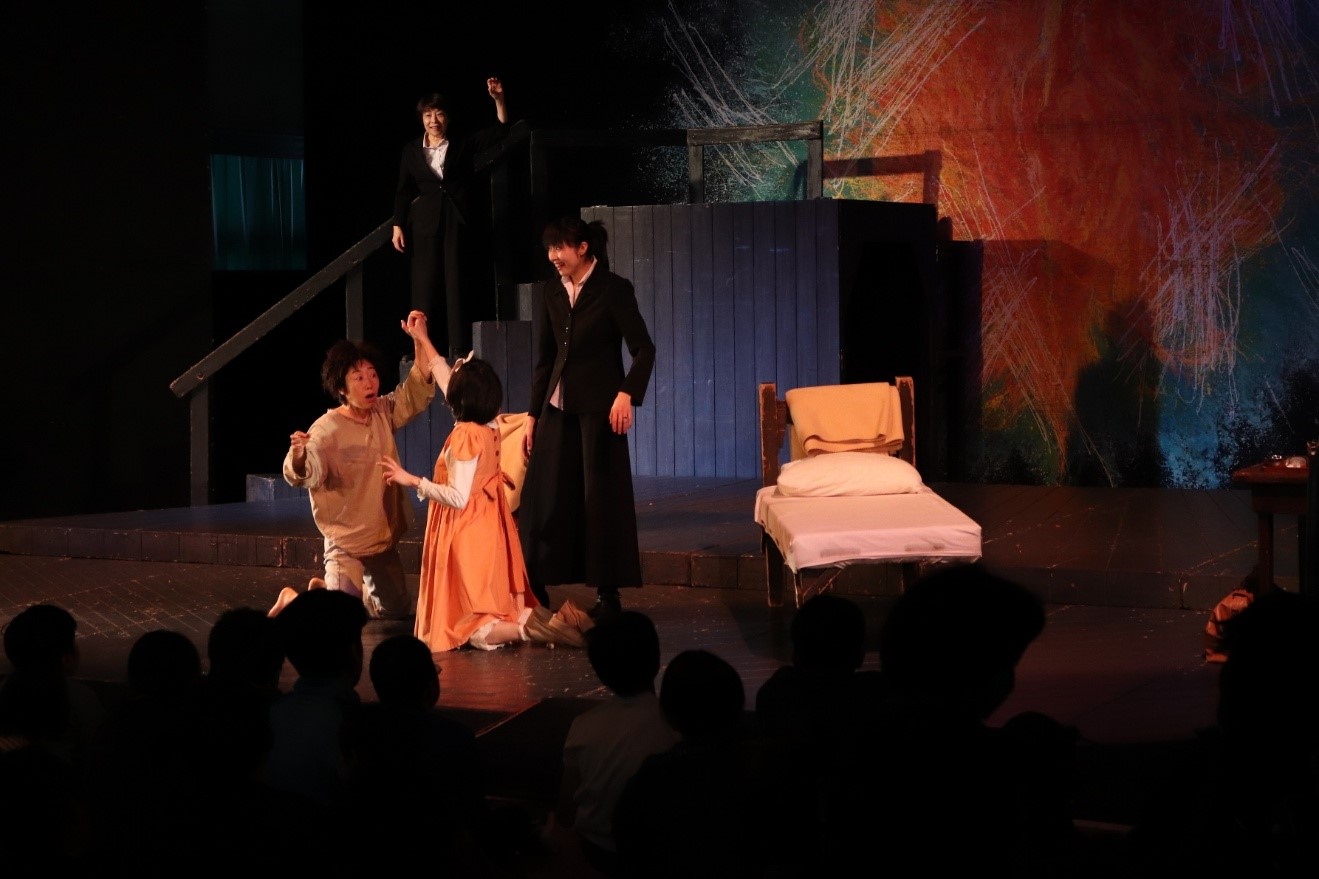 1月21日、東京演劇集団「風」の方を本校体育館にお招きして、文化芸術鑑賞・体験教室を行いました。児童生徒が当日登校すると、いつもの体育館が本物の舞台に変わっており、大きなライトや見たことのない機器を目にして興奮していました。ワークショップではクライマックスシーンを俳優の方と一緒に演じたり、カーテンコールでの子守唄を一緒に歌ったりすることができました。公演本番では、俳優の方が話すせりふや動きのダイナミックさに驚き、どの児童生徒も魅了されていました。児童生徒からは「すごかった こんなの見るの初めてです」といった感想が多数聞かれるなど、演劇の素晴らしさを体感することができました。