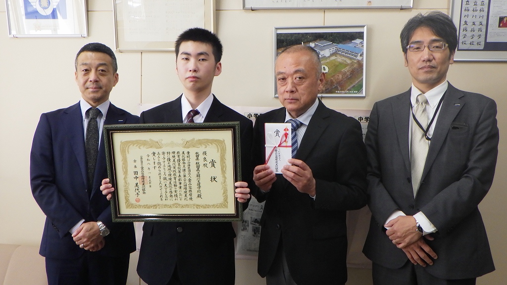 この度、本校は、公益社団法人食品容器環境美化協会が主催する「第26回 環境美化教育優良校等表彰事業」において、優秀校に選出されました。2月20日(金)、本校校長室にて表彰伝達が行われ、中学部2年生の石山晴仁さんが代表として表彰状と副賞などを受け取りました。今回の受賞は、本校が「地域の人を笑顔に!自分たちも笑顔に!」を合言葉に継続してきた、クリーンアップ活動「いーな・きらきらプロジェクト」の取り組みが高く評価されたものです。今後も「地域と共に育ち、共に学ぶ学校」を目指し、地域貢献に取り組んでいきたいと考えています。