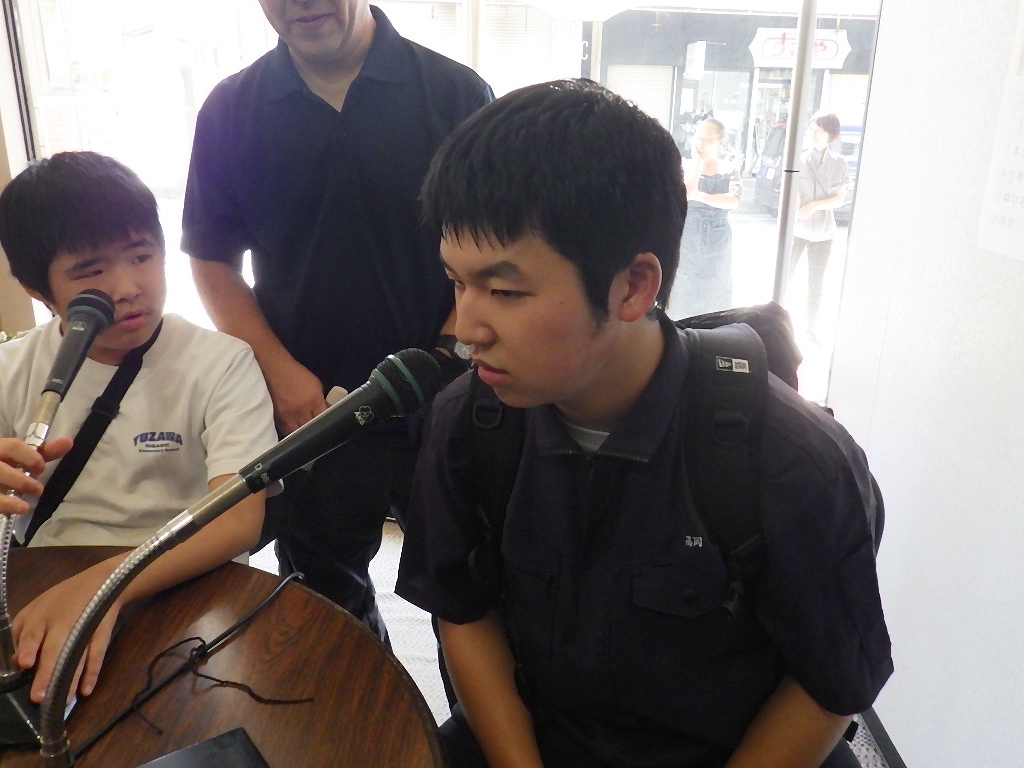 清掃をしていると、商店街の方や道行く人たちから「きれいになったね」「ありがとう」の言葉をたくさん掛けていただき、子どもたちはうれしそうな表情を見せていました。また、サンロード商店街のFMゆーとぴあの方からインタビューを受けることになり、5人の子どもたちがラジオの生放送に出演しました。子どもたちは緊張しながらも清掃で頑張ったことを話し、4日後に開催される「うどんエキスポ」の宣伝をしました。