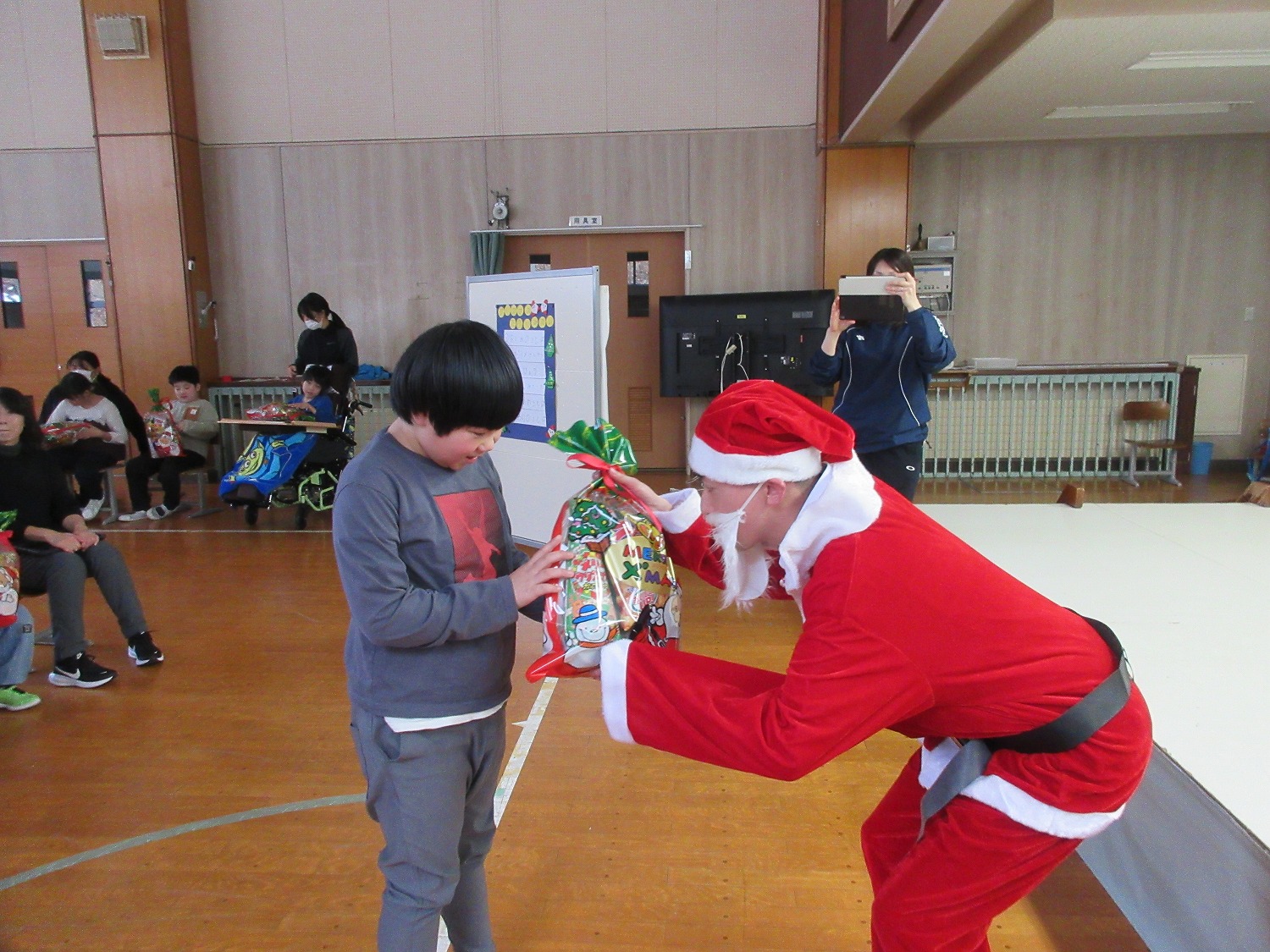発表の後は、サンタさんから一人ずつすてきなクリスマスプレゼントをいただき、子どもたちは「ありがとう」とお礼を言ったり、うれしそうにプレゼントを抱きしめたりしていました。また、小学部のみんなからもお礼の手紙とプレゼントをサンタさんへ渡し、笑顔いっぱいのクリスマス楽しみ会になりました。