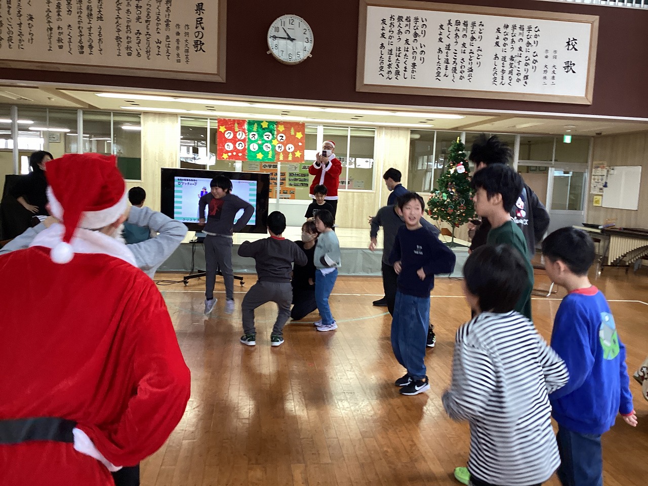 当日は、今年度もイオンスーパーセンター湯沢店の方々がサンタさんに扮して、学校に来てくださいました。子どもたちは大歓声でサンタさんたちを迎えて、音楽の学習で練習してきた合奏や歌、ダンスの発表をしました。たくさんの拍手をもらって、音楽発表は大成功!サンタさんと一緒にダンスも踊り、大盛り上がりでした。